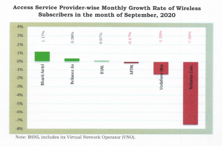 Total wireless subscribers (2G, 3G & 4G) increased from 1,147.92 million at the end of August-2020 to 1,148.58 million at the end of September-2020, thereby registering a monthly growth rate of 0.06%. The Wireless Tele-density in India decreased from 84.77 at the end of August-2020 to 84.74 at the end of September-2020.