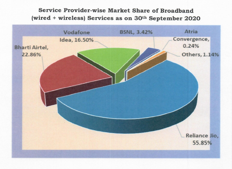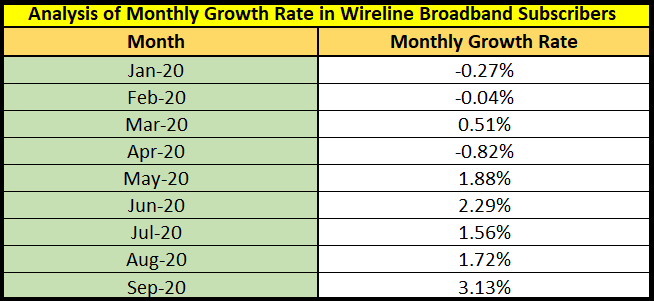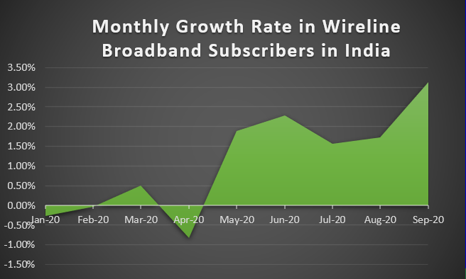 Telecom Regulatory Authority of India (TRAI) has released latest telecom subscription data for the month of September 2020. As per the latest report, India’s monthly growth rate of wireline broadband subscribers was 3.13% in September 2020.