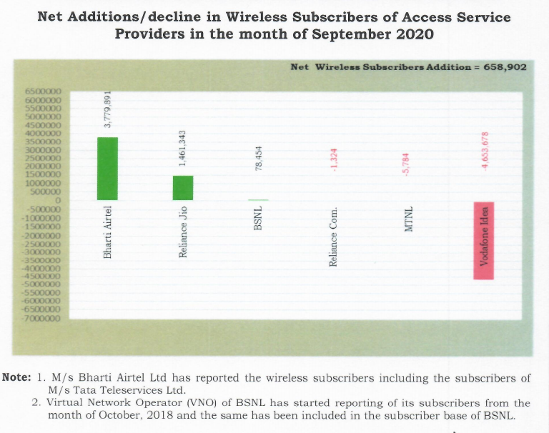 Vodafone Idea witnessed a massive decline in net addition in customer base in the month of September 2020 where they lost 46.54 lakh existing customers all over India. Reliance Communications & MTNL also witnessed decline in net additions in September 2020. Bharti Airtel added maximum number of customers (37.8 lakh) in September 2020 which is followed by Rliance Jio (14.6 lakh) and BSNL (78,454).