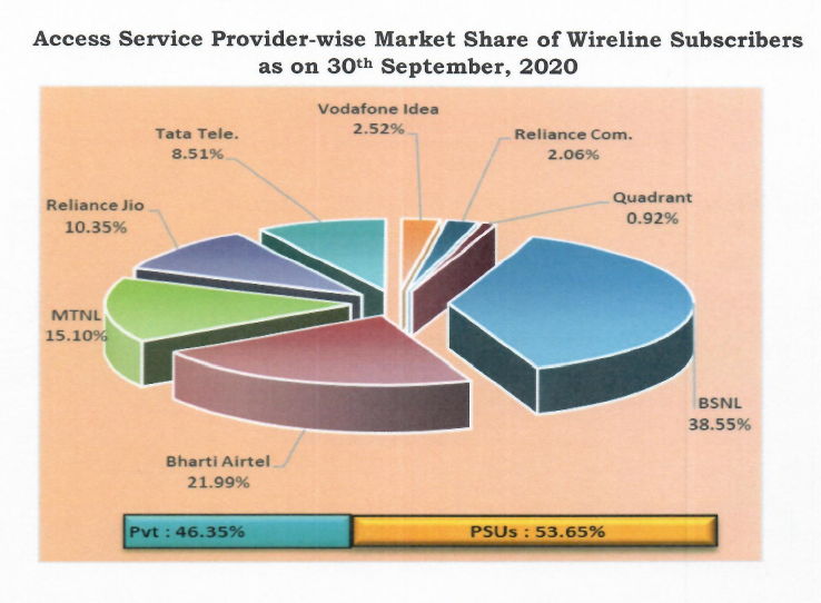 Wireline subscribers increased from 19.89 million at the end of August-2020 to 20.08 million at the end of September-2020. Net addition in the wireline subscriber base was 0.19 million with a monthly growth rate of 0.95%. The Overall Wireline Tele-density increased from 1.47 at the end of August-2020 to 1.48 at the end of September-2020. BSNL and MTNL, the two PSU access service providers, held 53.65% of the wireline market share as on 30th September, 2020.