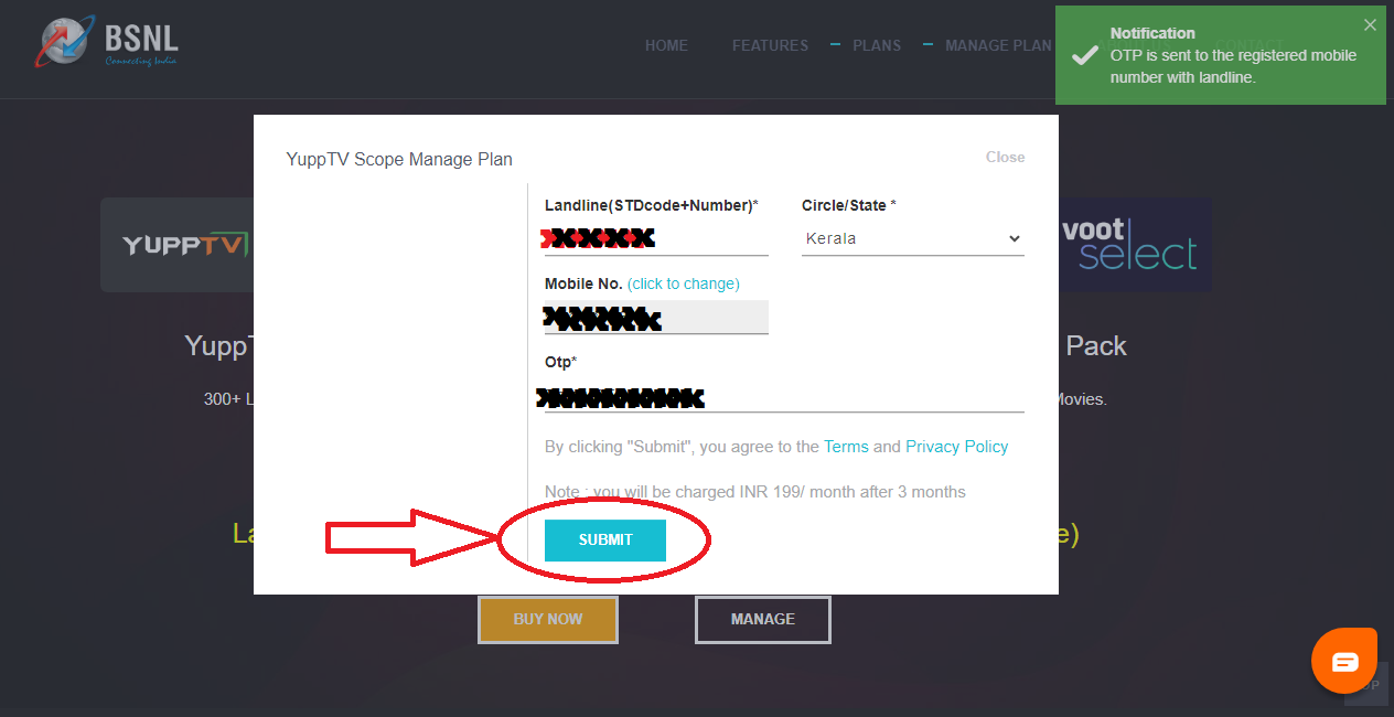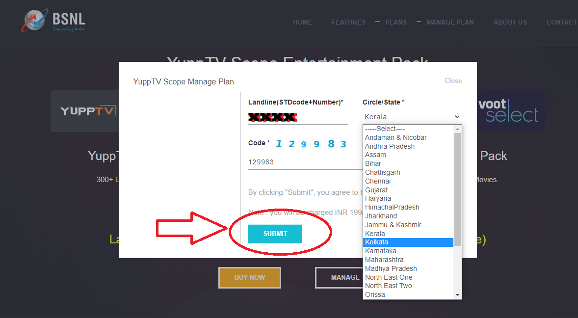 Then, select your state, enter the captcha and click on ‘Submit’ button. After that, an OTP will be sent to the registered mobile number of your BSNL Broadband connection.
